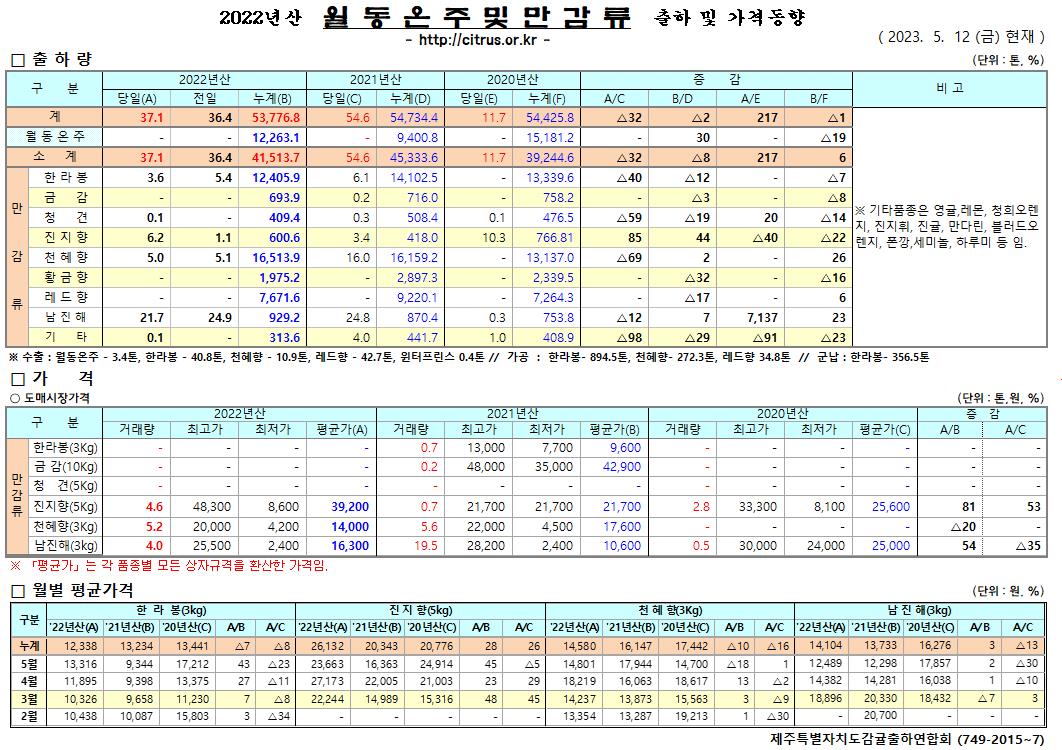 [월동&만감]2022년산 출하 및 가격동향(5/12)