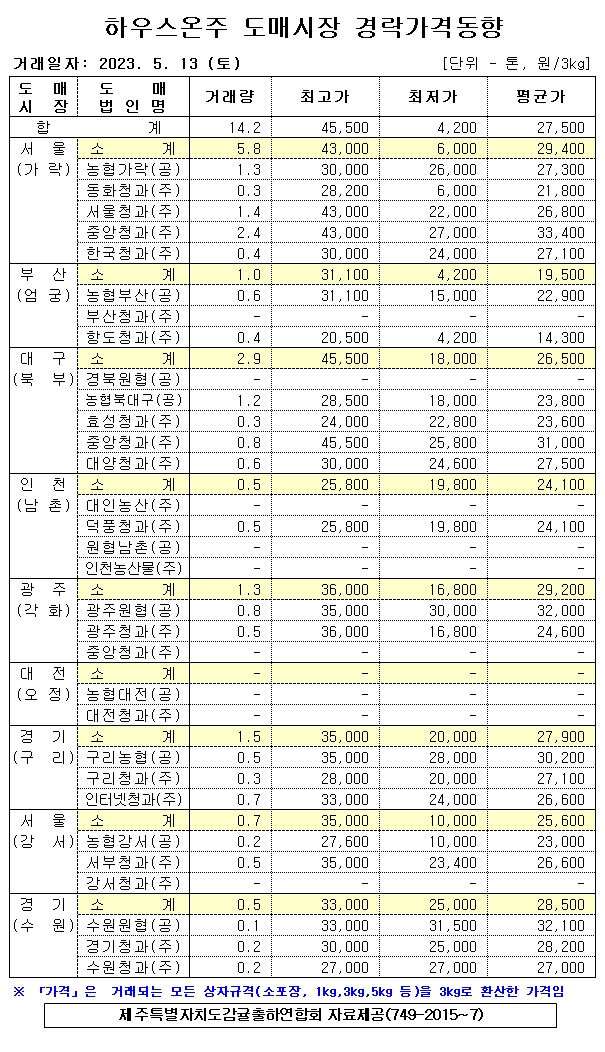 [하우스온주]9대도매시장 경락 가격(5/13]