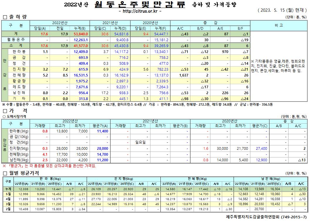 [월동&만감]2022년산 출하 및 가격동향(5/15)