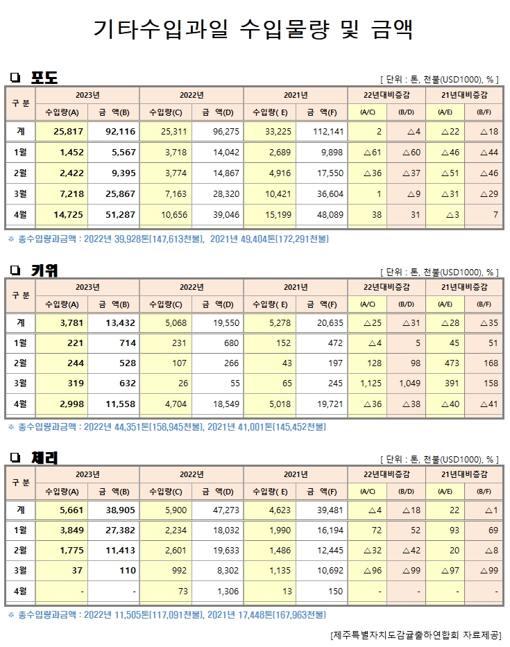 [수입기타과일]월별 수입물량 및 금액(23년4월말기준)