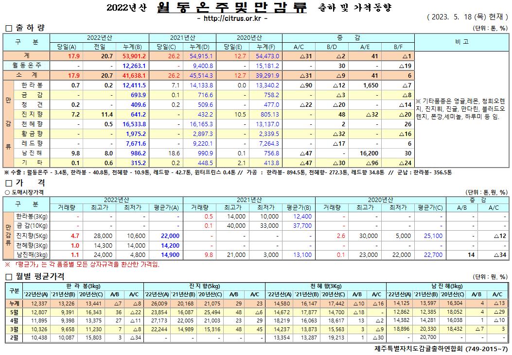 [월동&만감]2022년산 출하 및 가격동향(5/18)
