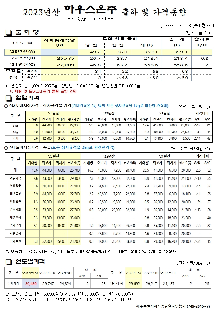 [하우스온주]2023년산 출하 및 가격동향(5/18)