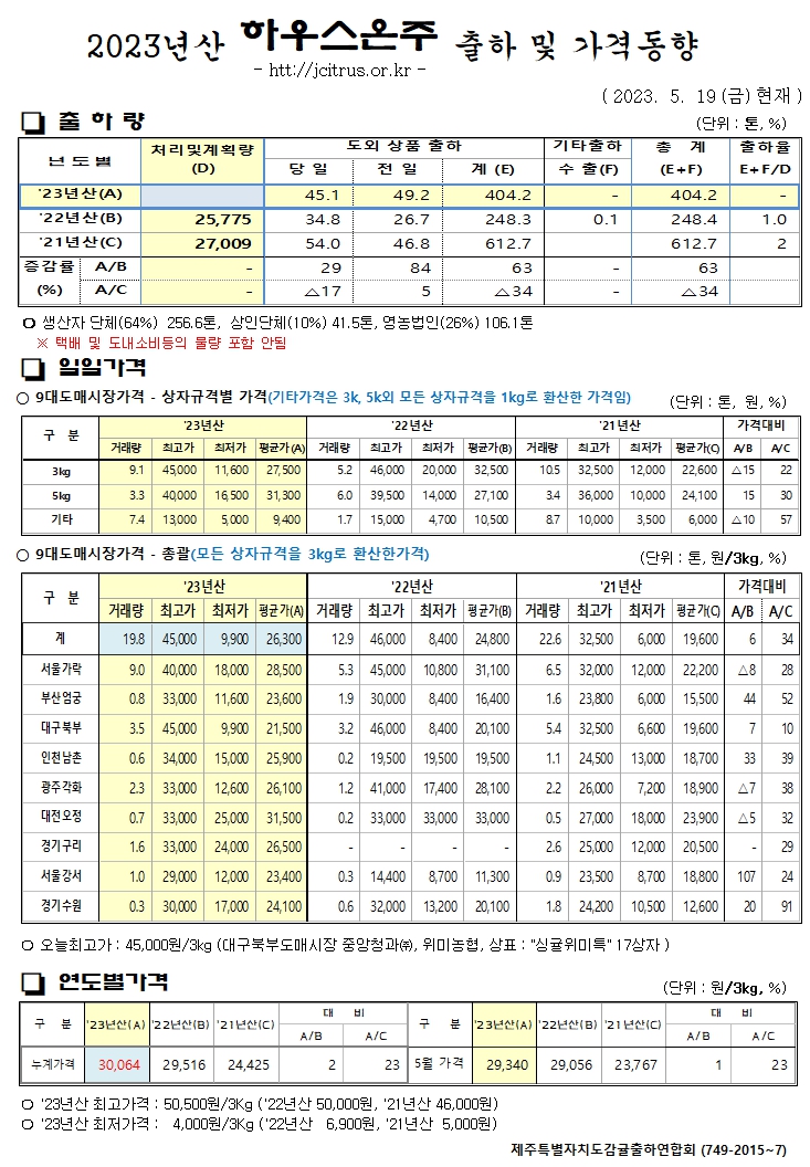 [하우스온주]2023년산 출하 및 가격동향(5/19)