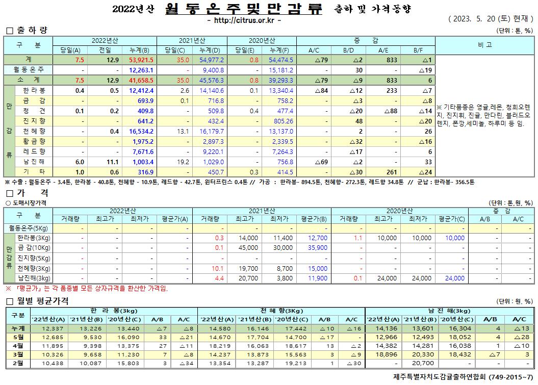 [월동&만감]2022년산 출하 및 가격동향(5/20)