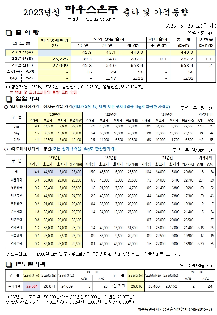 [하우스온주]2023년산 출하 및 가격동향(5/20)