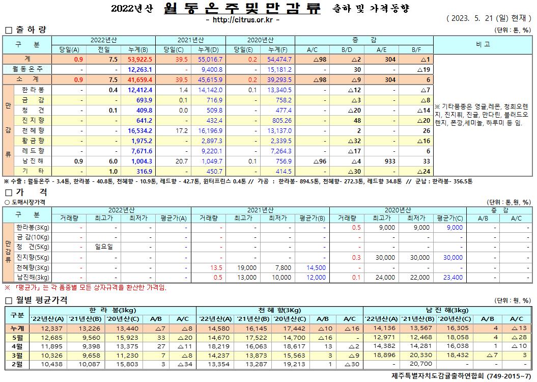 [월동&만감]2022년산 출하 및 가격동향(5/21)