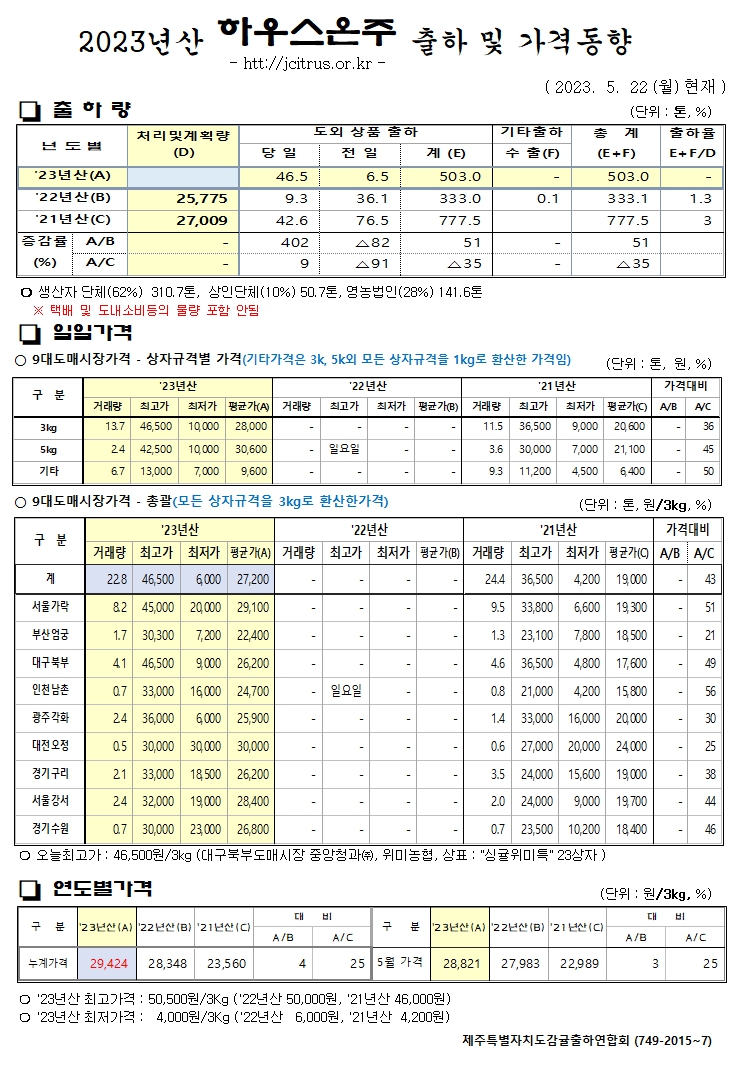 [하우스온주]2023년산 출하 및 가격동향(5/22)