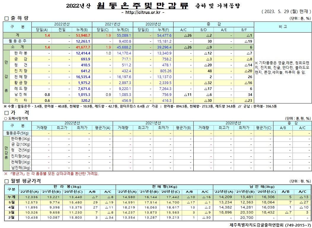 [월동&만감]2022년산 출하 및 가격동향(5/29)