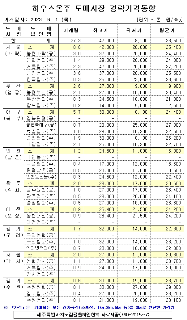 [하우스온주]9대도매시장 경락가격(6/1)