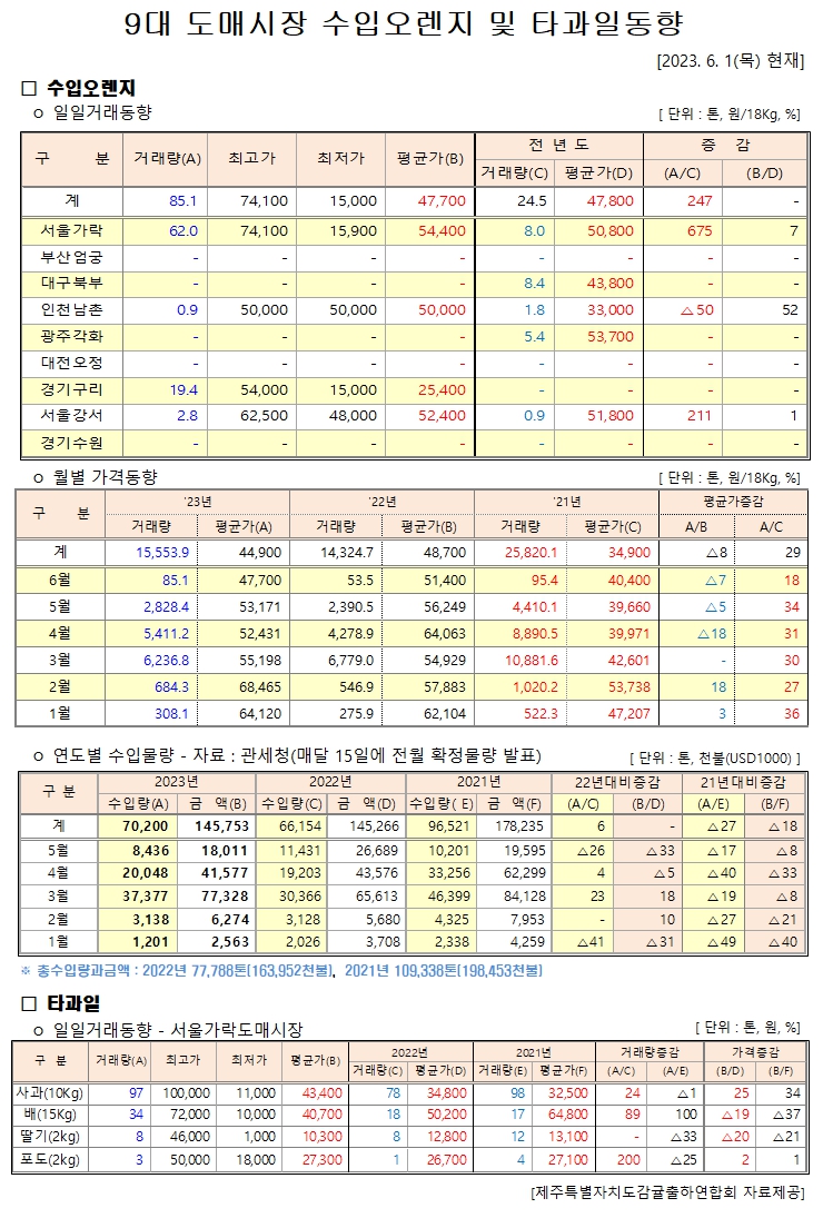 [수입오렌지&타과일]9대도매시장 경락가격(6/1)