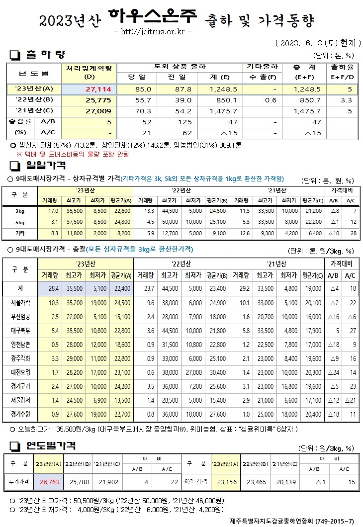 [하우스온주]2023년산 출하 및 가격동향(6/3)