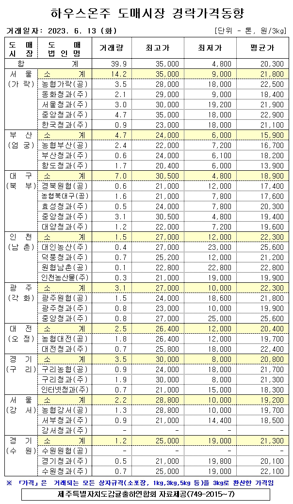 [하우스온주]9대도매시장 경락가격(6/13)