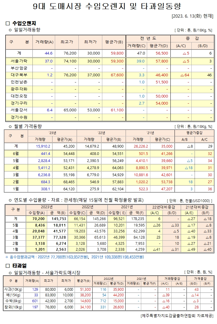 [수입오렌지&타과일]9대도매시장 경락가격(6/13)