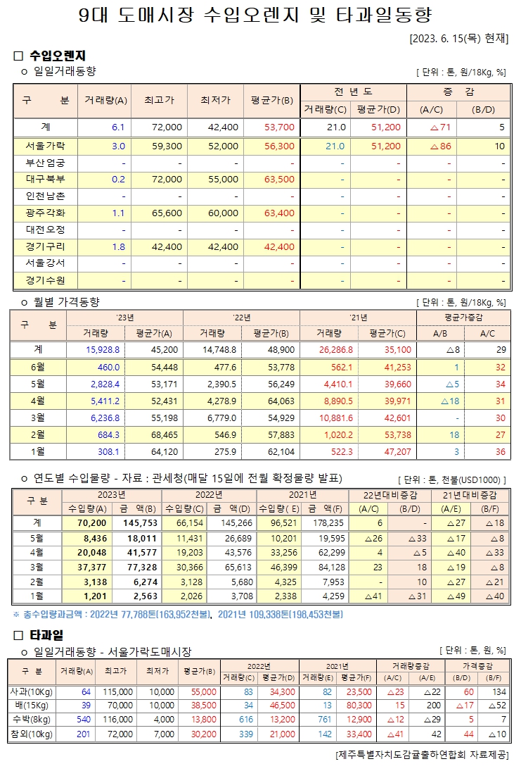 [수입오렌지&타과일]9대도매시장 경락가격(6/15)
