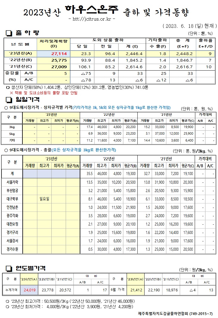 [하우스온주]2023년산 출하 및 가격동향(6/18)