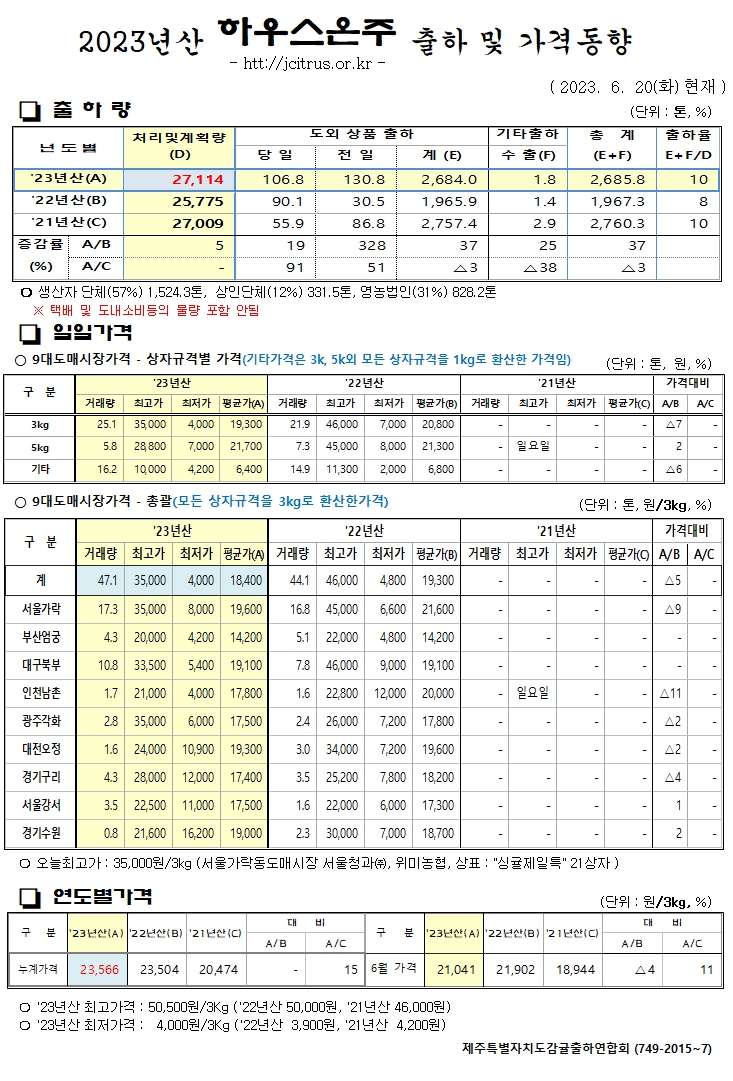 [하우스온주]2023년산 출하 및 가격동향(6/20)
