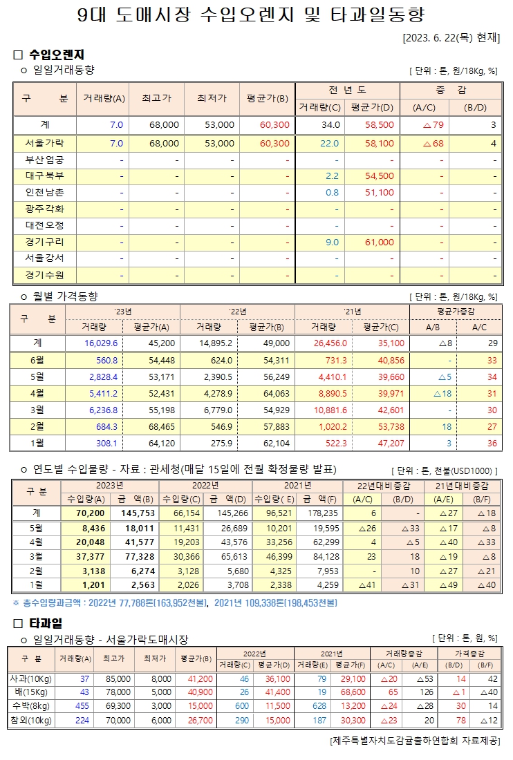 [수입오렌지&타과일]9대도매시장 경락가격(6/22)