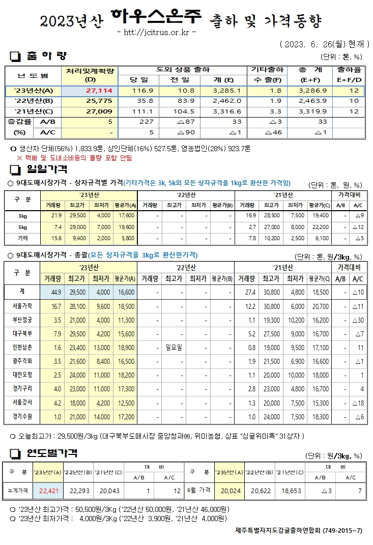 [하우스온주]2023년산 출하 및 가격동향(6/26)