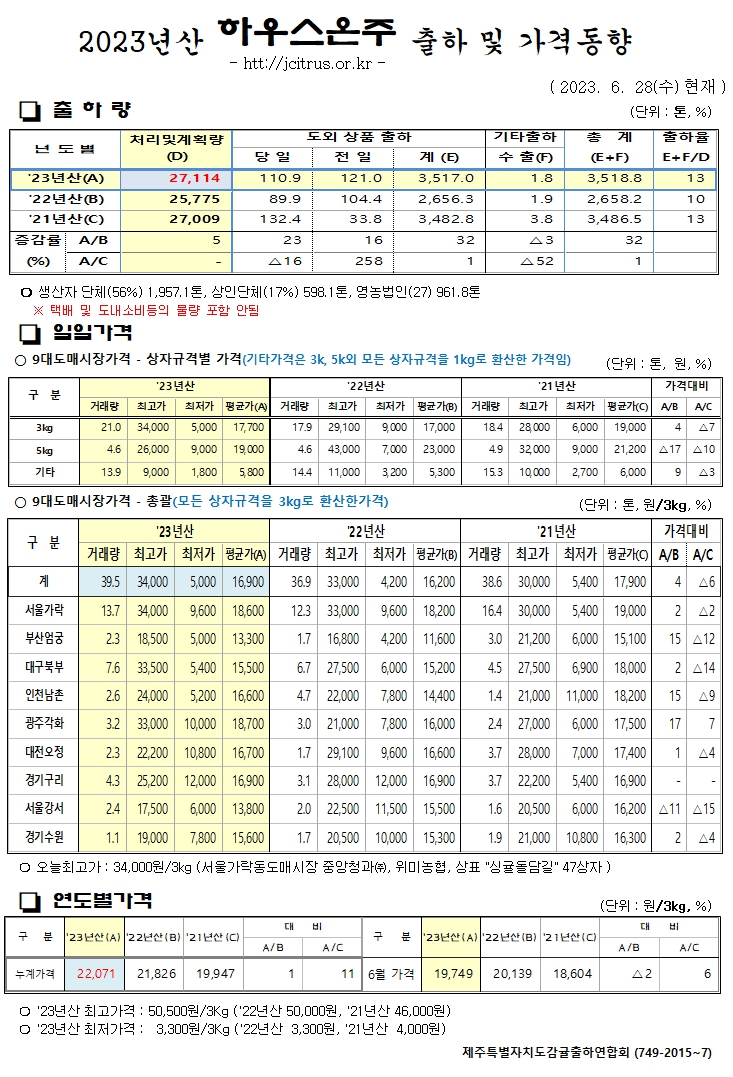 [하우스온주]2023년산 출하 및 가격동향(6/28)