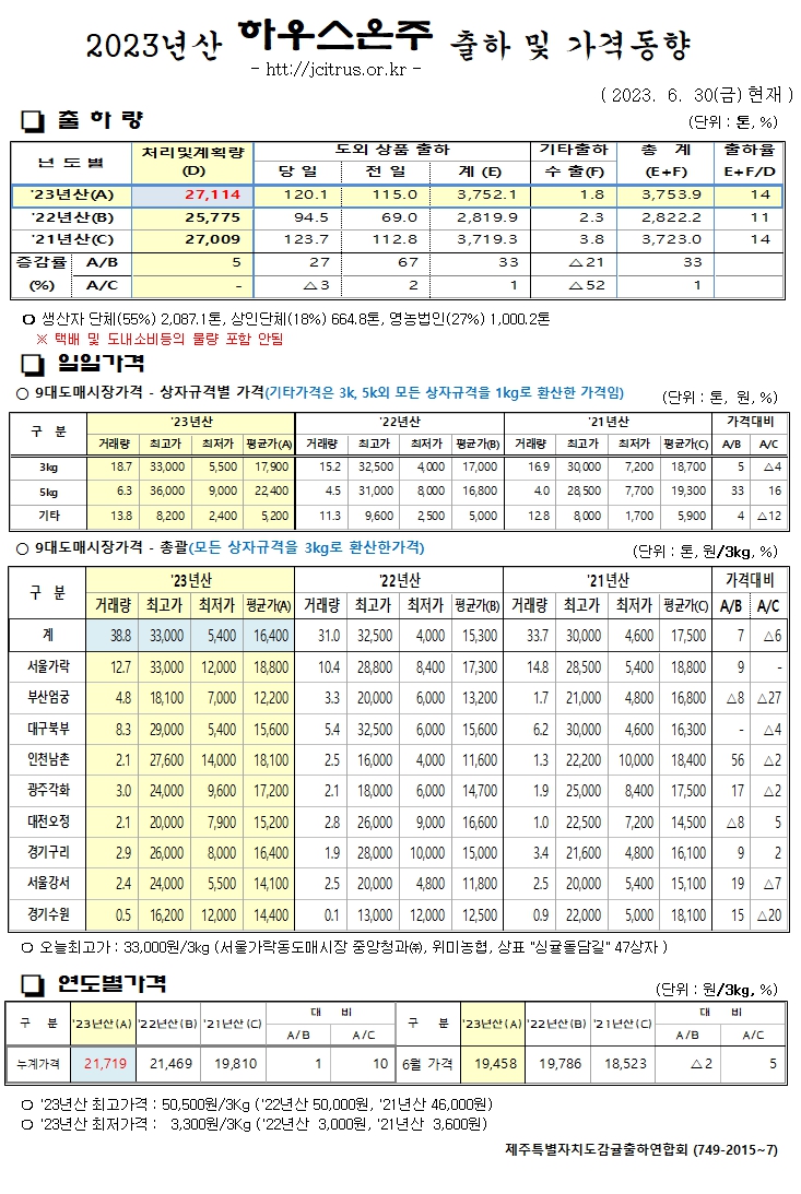 [하우스온주]2023년산 출하 및 가격동향(6/30)