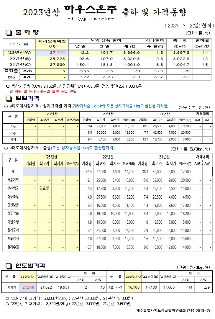 [하우스온주]2023년산 출하 및 가격동향(7/2)