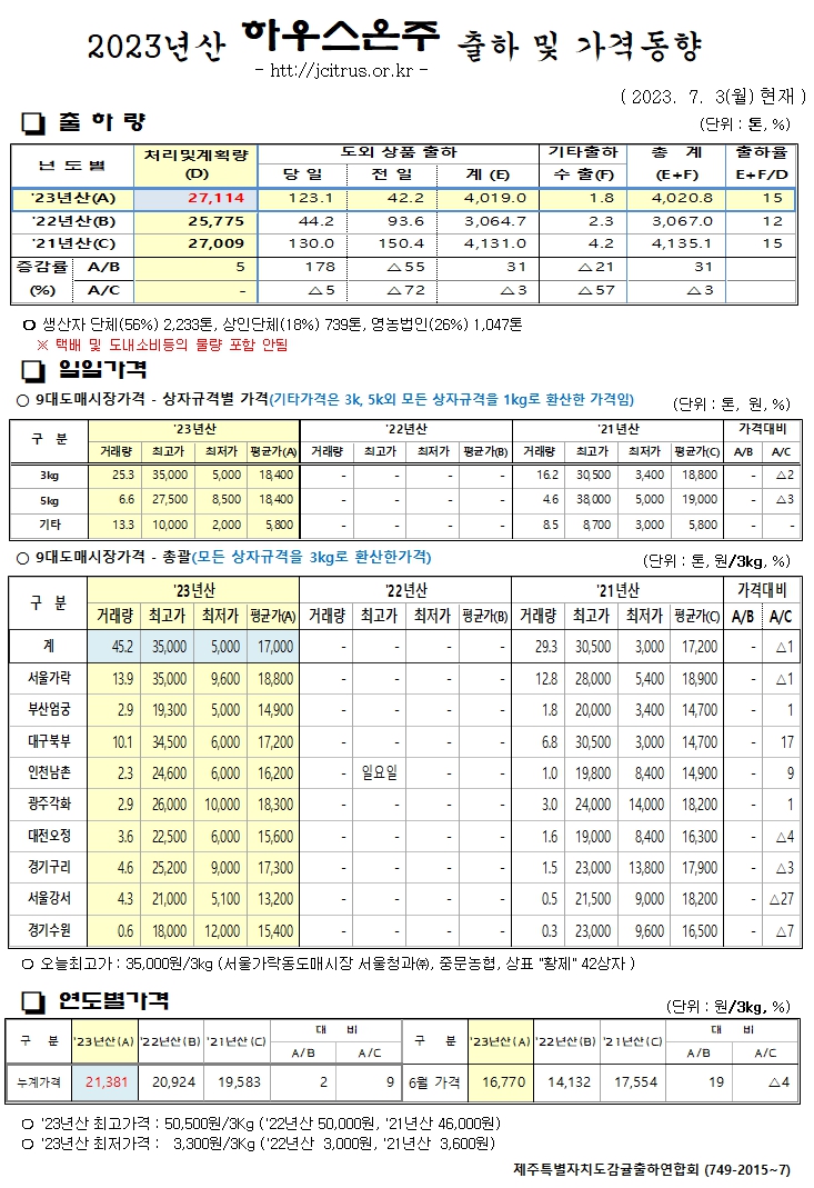 [하우스온주]2023년산 출하 및 가격동향(7/3)