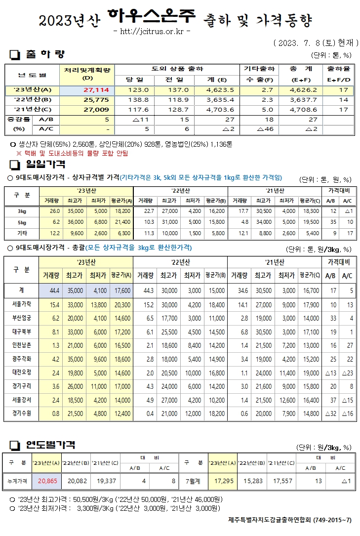 [하우스온주]2023년산 출하 및 가격동향(7/8)