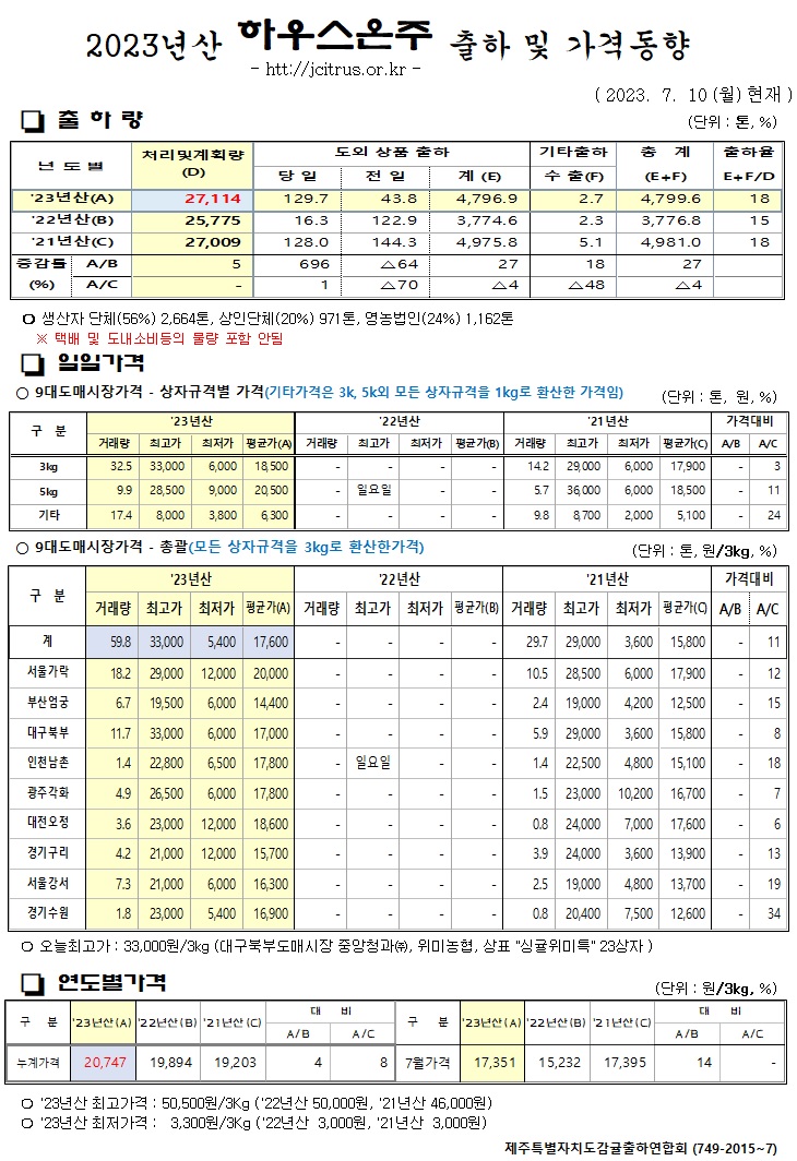 [하우스온주]2023년산 출하 및 가격동향(7/10)