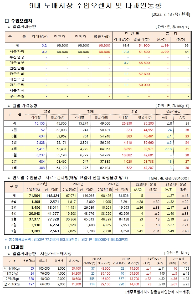 [수입오렌지&타과일]9대도매시장 경락가격(7/13)