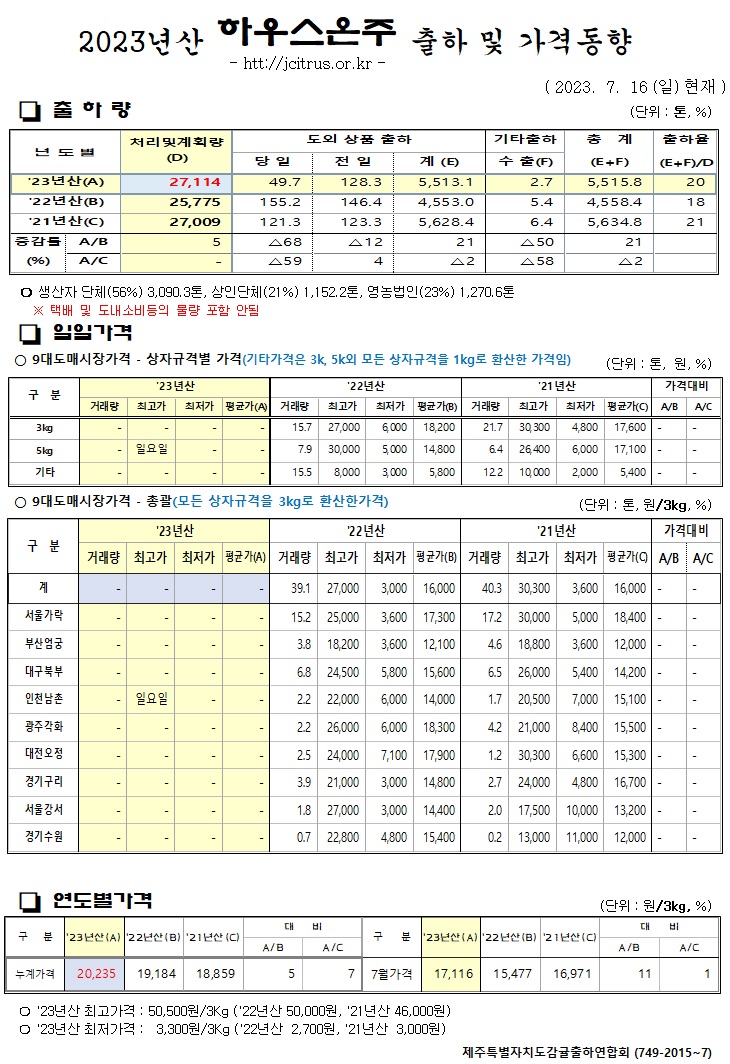 [하우스온주]2023년산 출하 및 가격동향(7/16)
