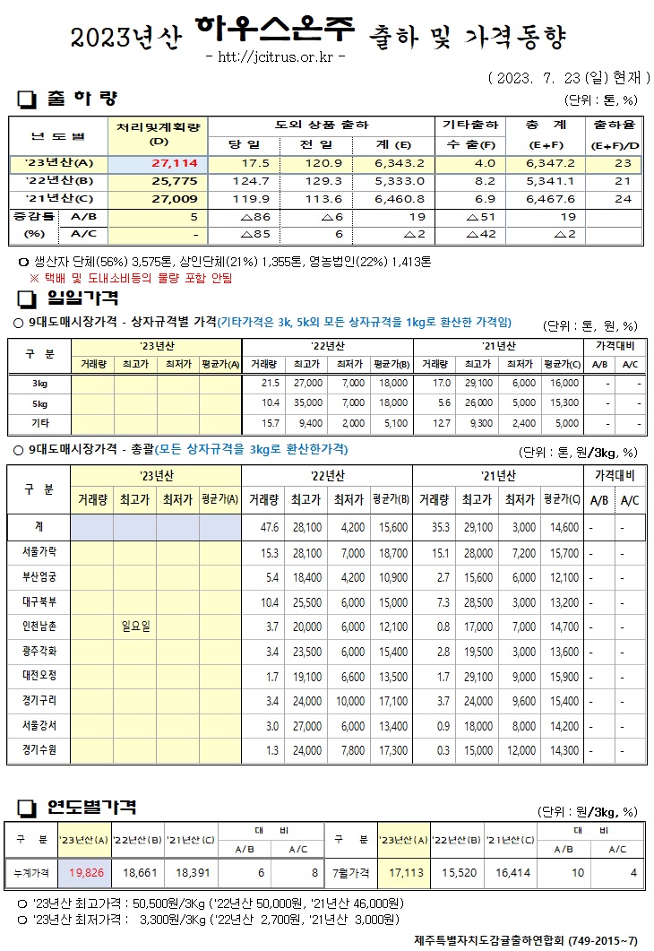 [하우스온주]2023년산 출하 및 가격동향(7/23)