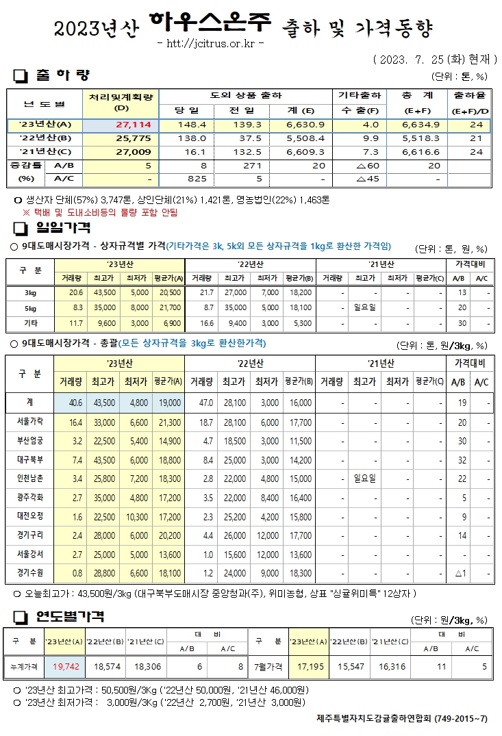 [하우스온주]2023년산 출하 및 가격동향(7/25)