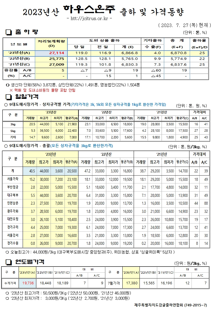 [하우스온주]2023년산 출하 및 가격동향(7/27)