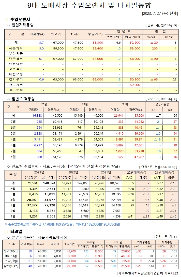 [수입오렌지&타과일]9대도매시장 경락가격(7/27)