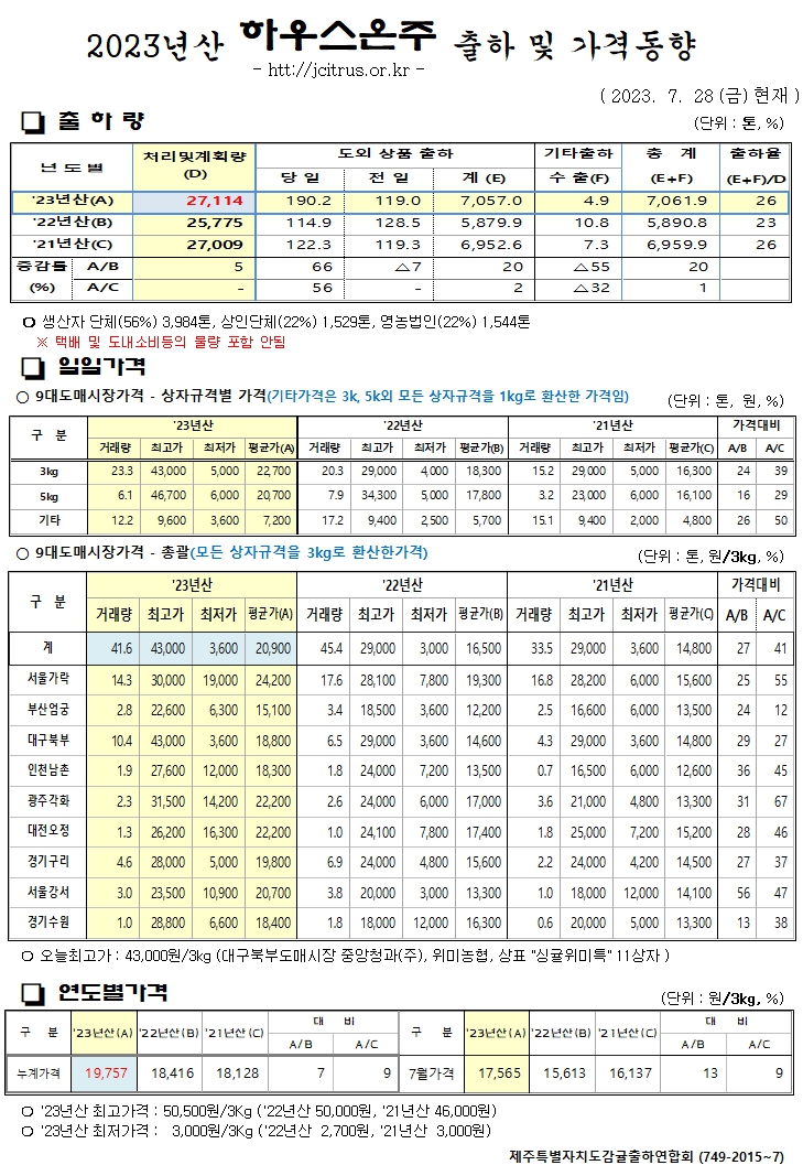 [하우스온주]2023년산 출하 및 가격동향(7/28)