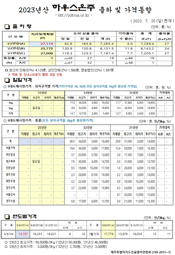 [하우스온주]2023년산 출하 및 가격동향(7/30)