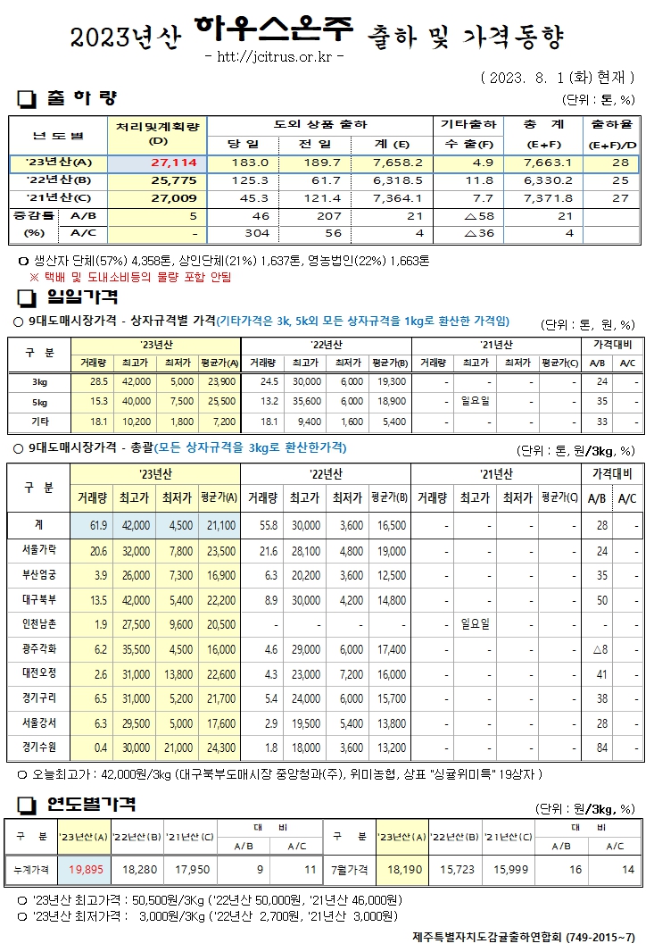 [하우스온주]2023년산 출하 및 가격동향(8/1)