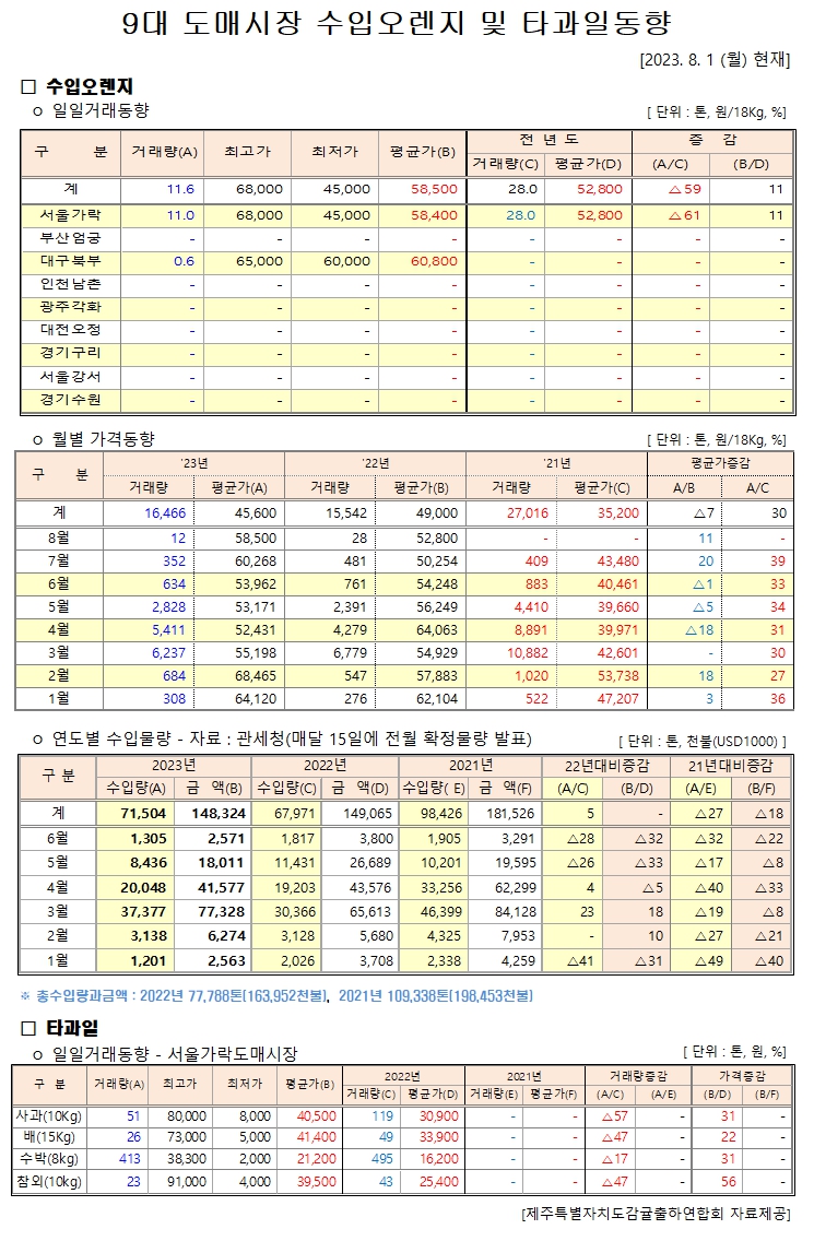 [수입오렌지&타과일]9대도매시장 경락가격(8/1)