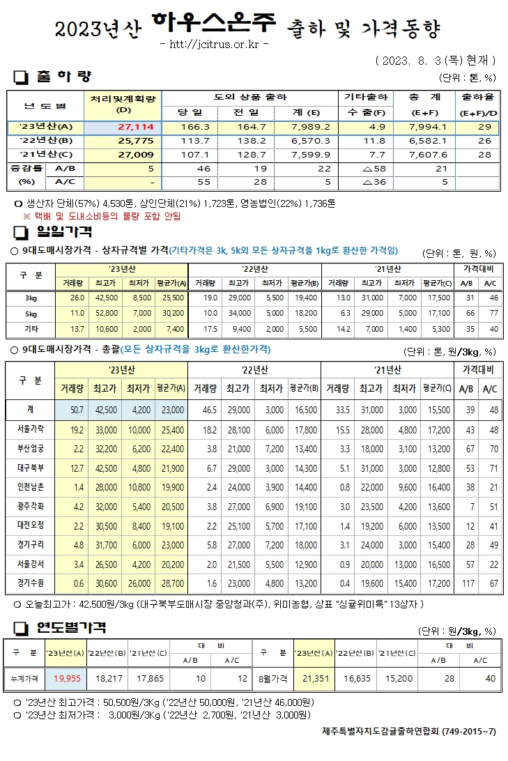 [하우스온주]2023년산 출하 및 가격동향(8/3)