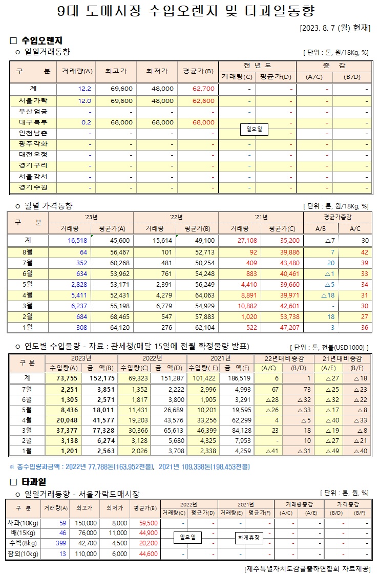[하우스온주]2025년산 출하 및 가격동향(10/9)