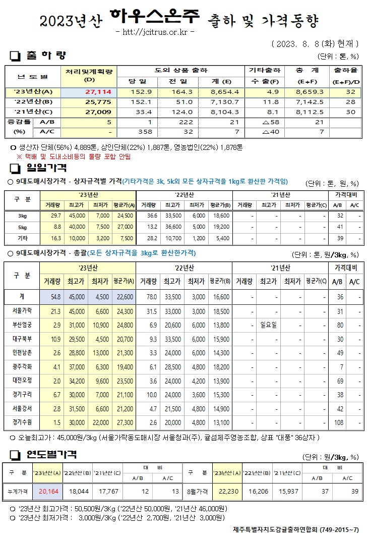 [하우스온주]2023년산 출하 및 가격동향(8/8)