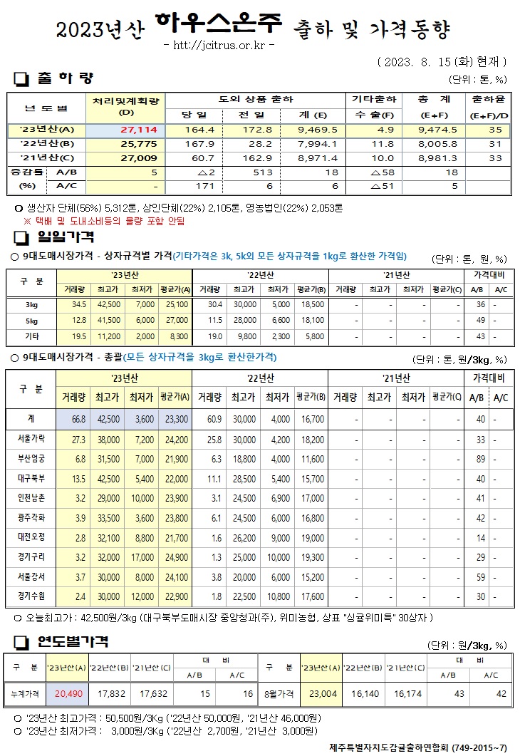 [하우스온주]2023년산 출하 및 가격동향(8/15)