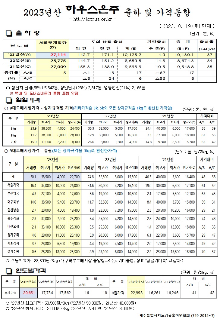 [하우스온주]2023년산 출하 및 가격동향(8/19)