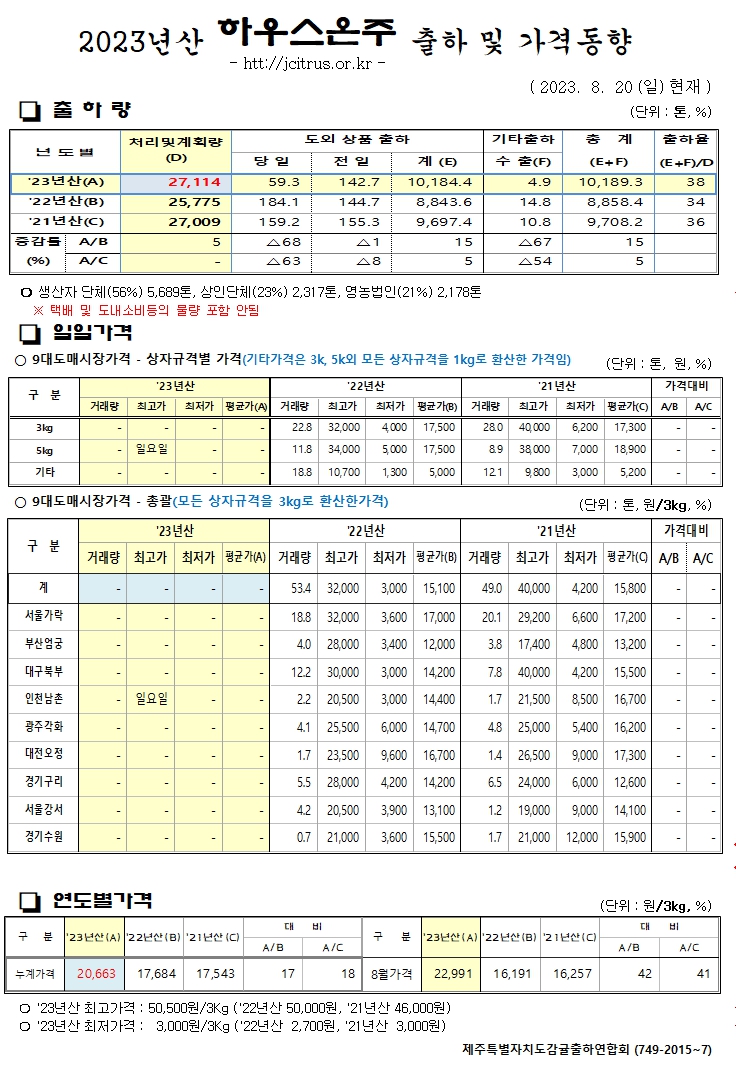 [하우스온주]2023년산 출하 및 가격동향(8/20)