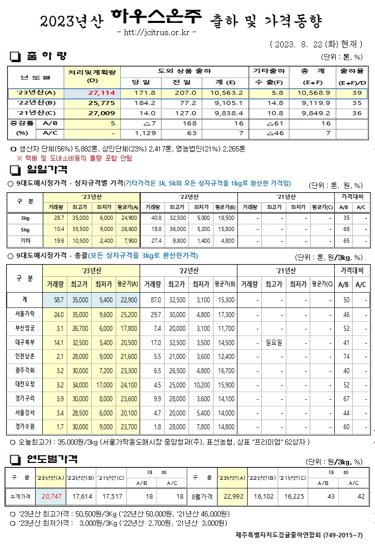 [하우스온주]2023년산 출하 및 가격동향(8/22)