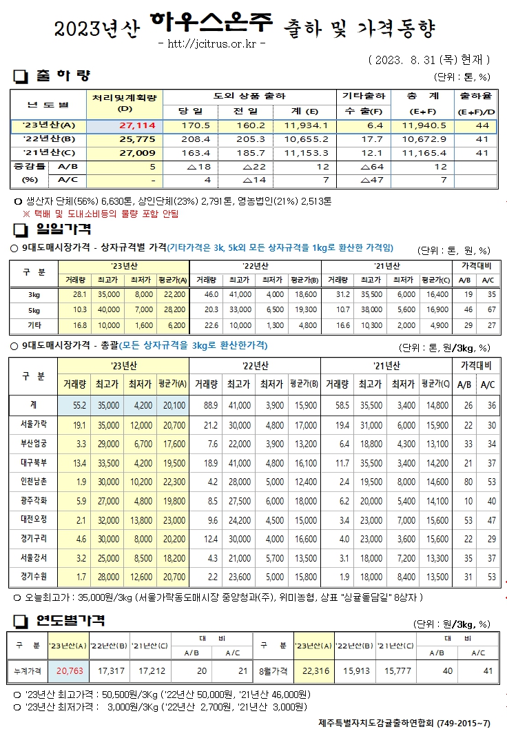 [하우스온주]2023년산 출하 및 가격동향(8/31)