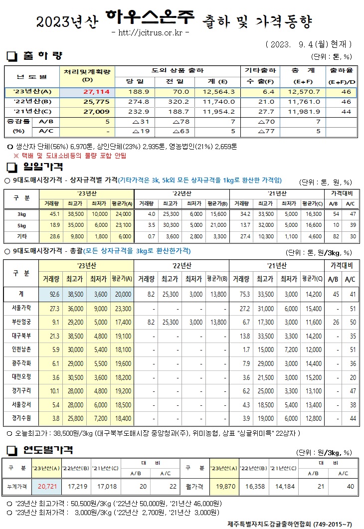 [하우스온주]2023년산 출하 및 가격동향(9/3)