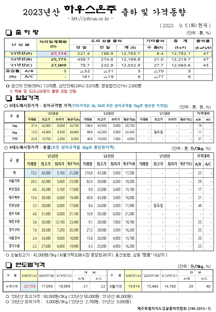 [하우스온주]2025년산 출하 및 가격동향(10/5)
