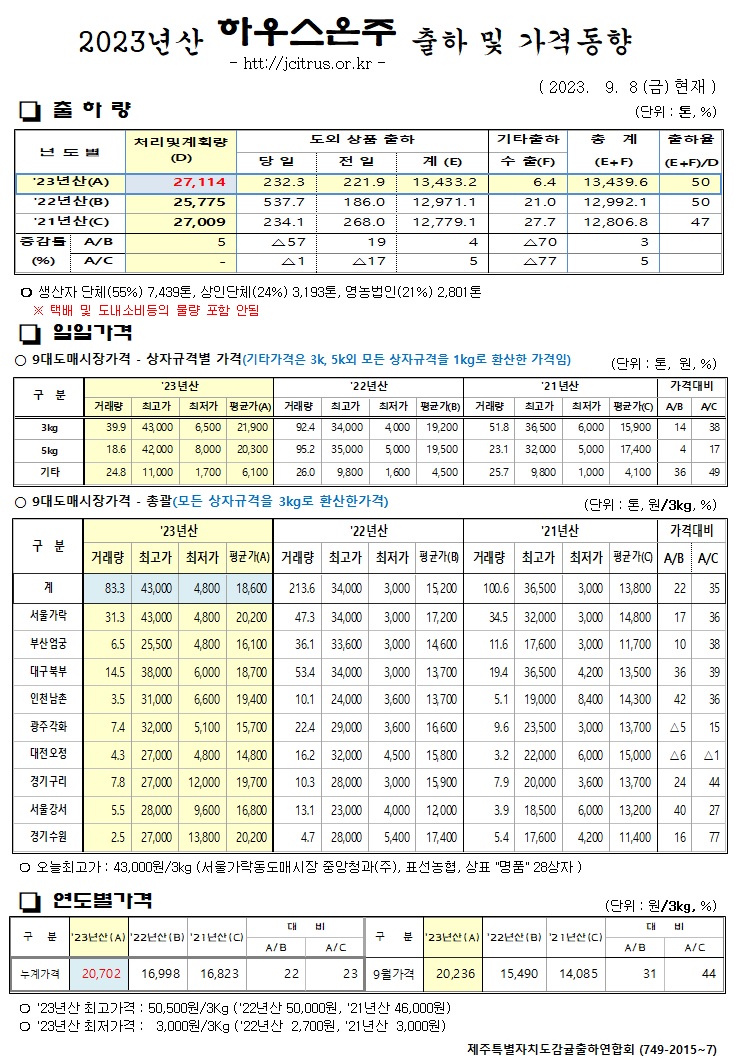 [하우스온주]2025년산 출하 및 가격동향(10/9)