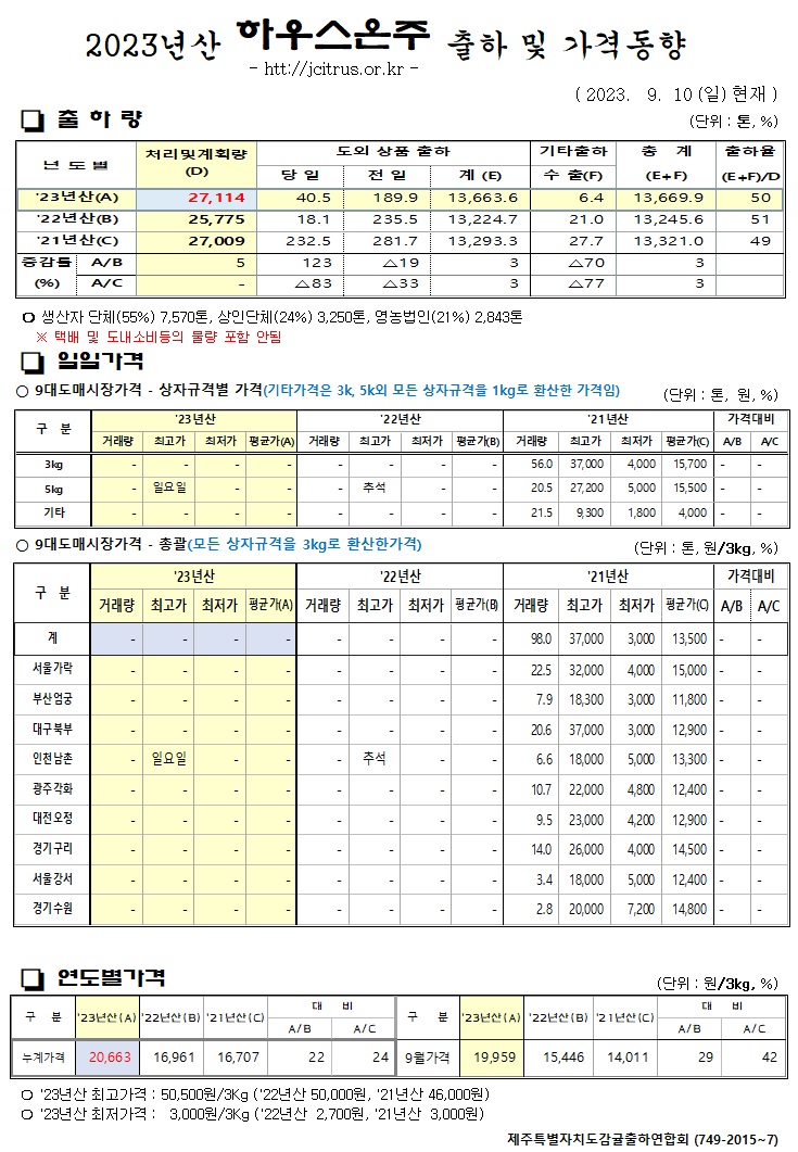 [하우스온주]2023년산 출하 및 가격동향(9/10)